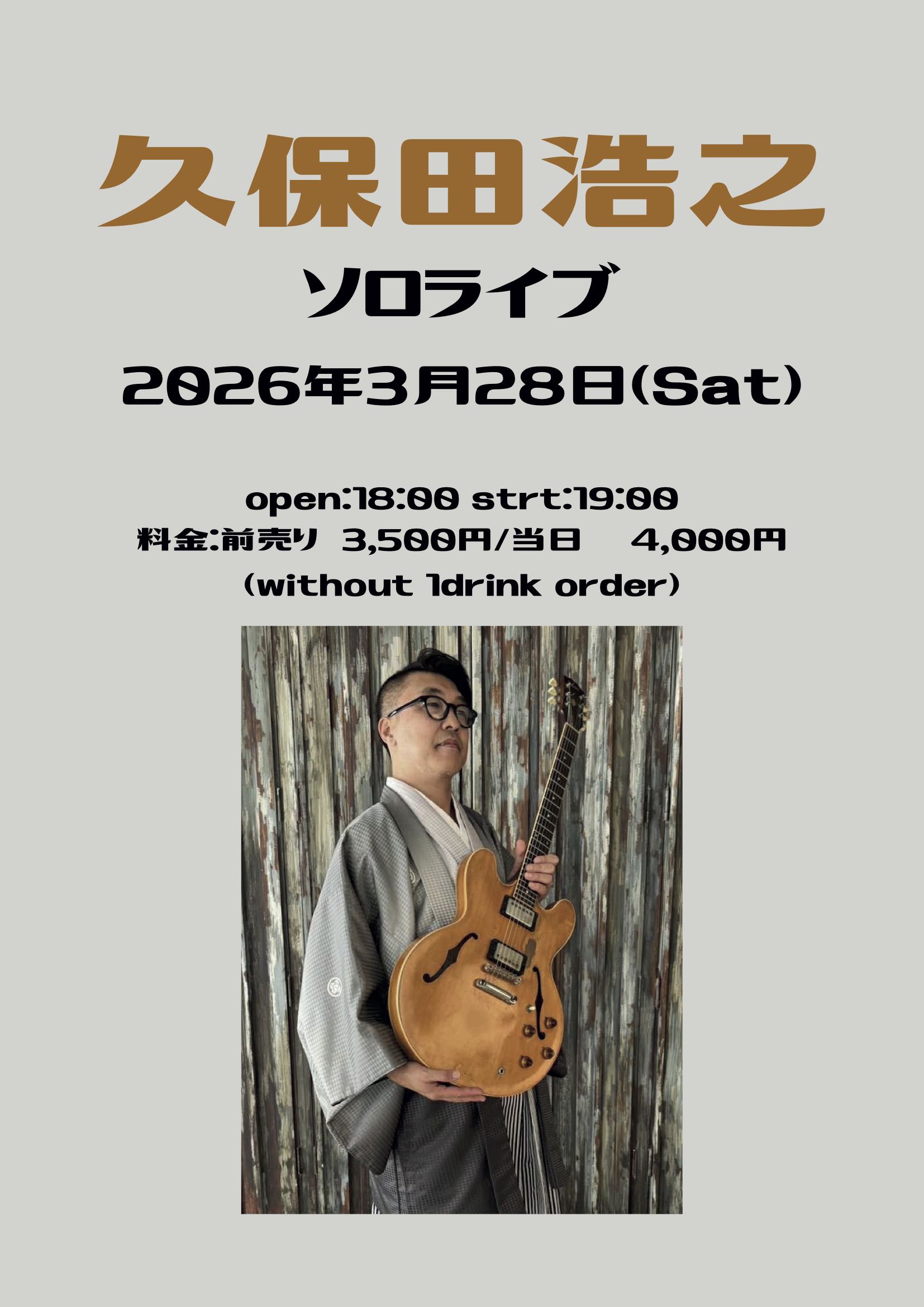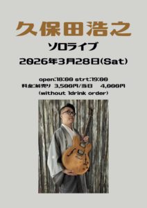 久保田 浩之 イベント日: 2026/03/28 (Sat) 開演時間: 19:00 open:18:00 start:19:00 料金:前売り¥3500 / 当日¥4000(without 1drink order) ■久保田浩之(Gt) 受付開始 御予約はこちらからお願いします。