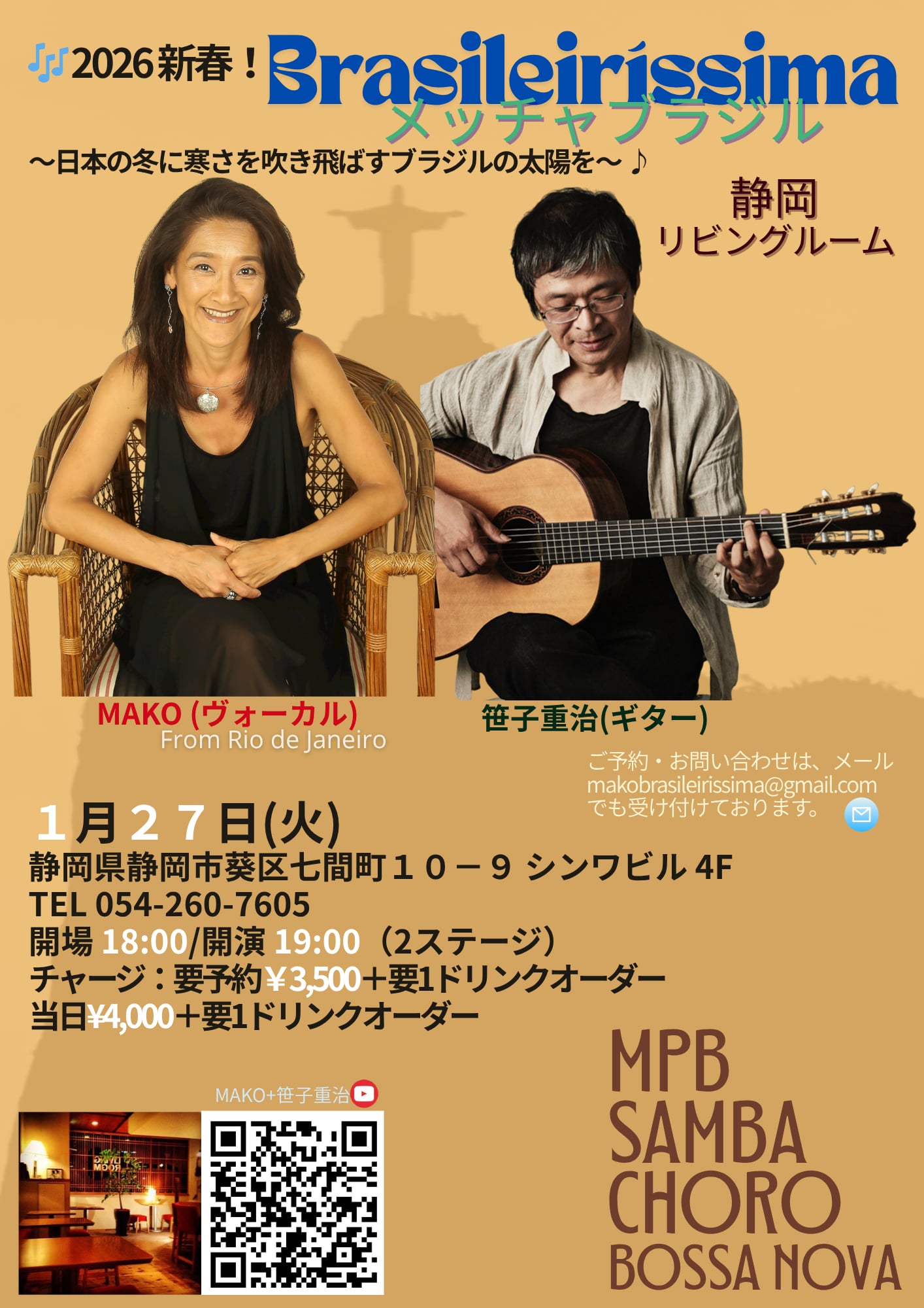MAKO with 笹子重治 イベント日: 2026/01/27 (Tue) 開演時間: 19:00 open:18:00 start:19:00 料金:¥3500(+ 1drink order) ■Vo.MAKO ■Gt.笹子重治 受付開始 御予約はこちらからお願いします。